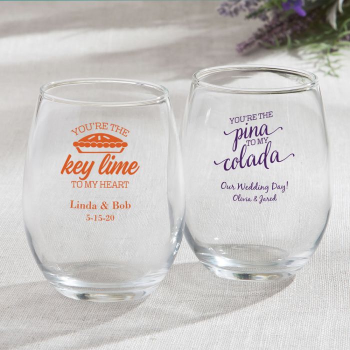 Add your own unique touch to your wine glasses when you personalize them with a fun tropical themed message. These beautifully curved glasses won't topple over and do not run the risk of having stems broken. They also make fabulous dessert glasses.